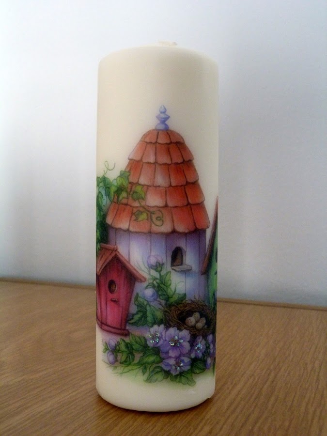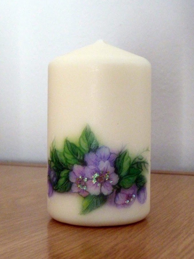 Las tres están hechas con la misma lámina de papel de Stamperia, escogiendo los motivos que me iban mejor con el tamaño de cada vela.