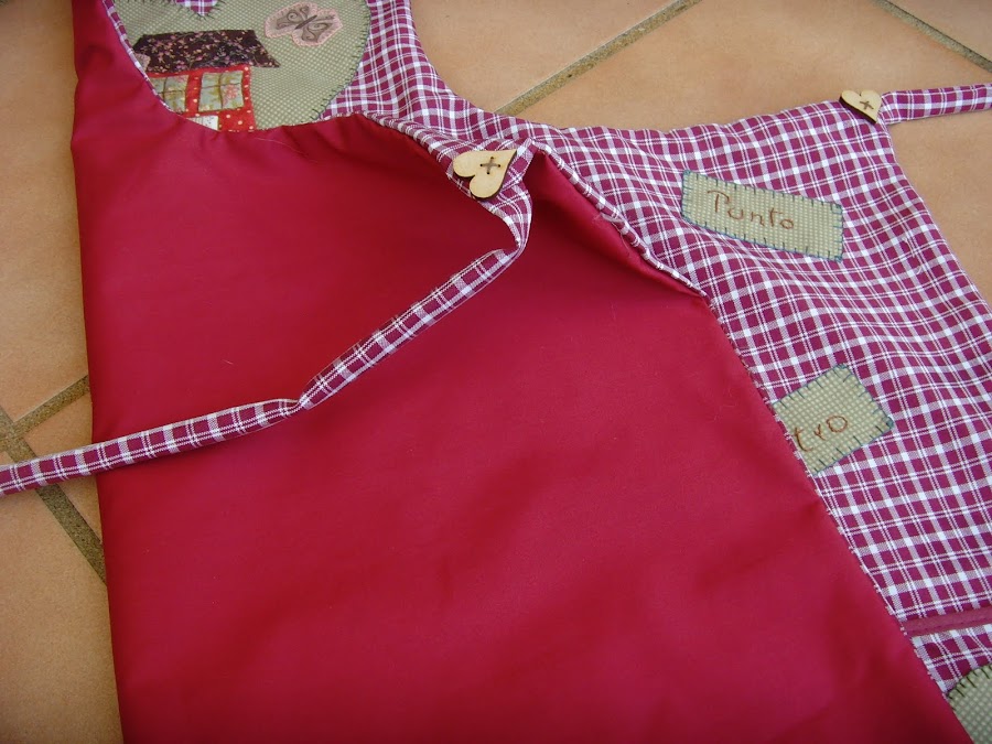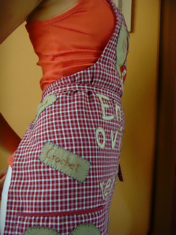 No conforme con eso le añadí unos cartelitos bordados con punto atrás con todas las labores que me gusta hacer, como también son de cuadritos están cosidas al delantal con más punto de festón le dan un aire un poco más rústico y más country, justo como me gusta.