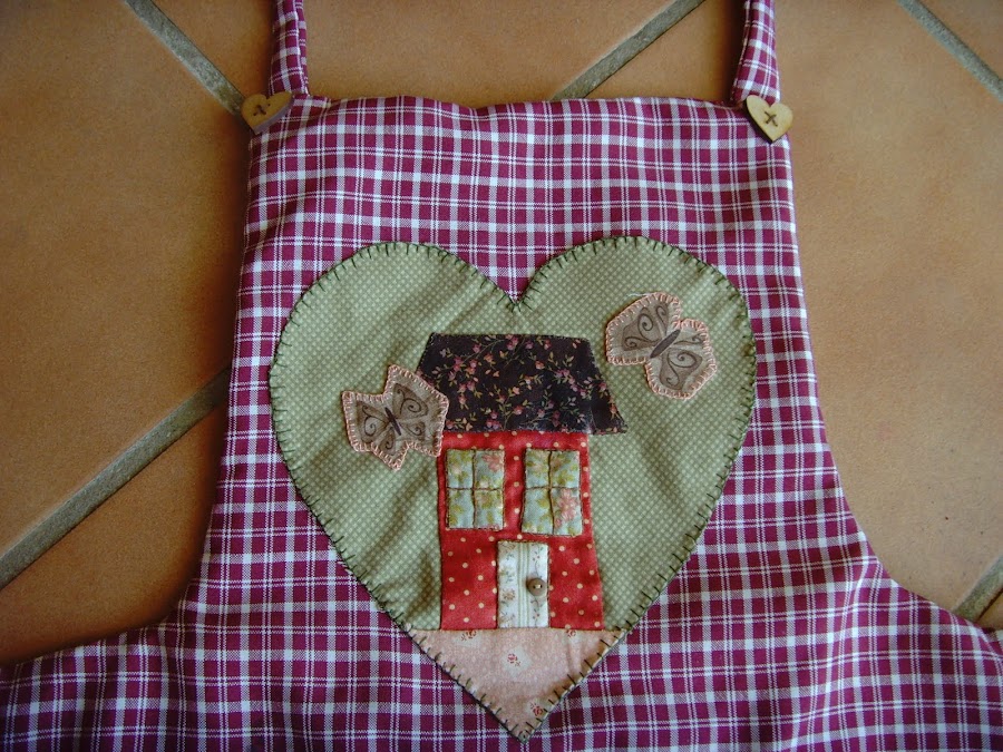 El primer corazón es mi casa, bueno, o una parecida, está cosida como aplicación sobre un gran corazón y después éste lo he cosido al delantal con punto de festón.