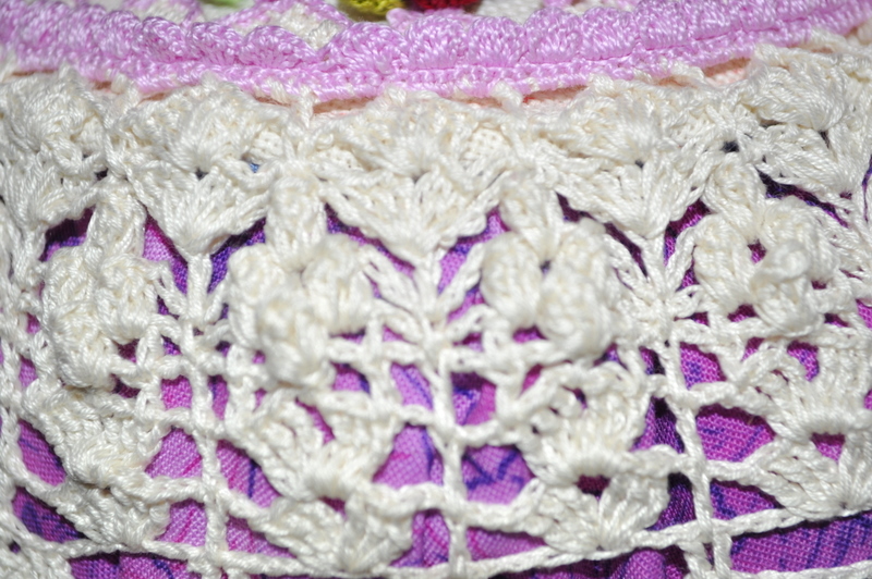 EL armazón es un bote de plástico y lo rellené alrededor de floca y lo vestí con una tela a tono y una vez hecho esto empecé a crecer y menguar,hasta acabar en menos para que quedara la puntillita encima de donde se pinchan las agujas,en color rosa con piquito.