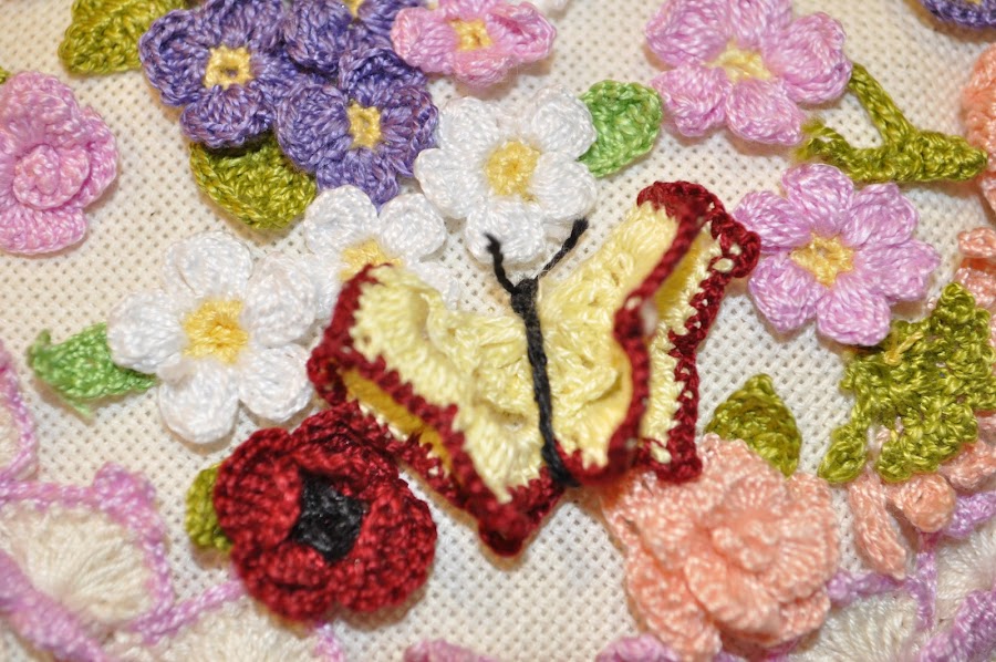 Y para las flores, las mariquitas, las hojas y las mariposas,con un ganchillo del 0,65.Los dos de la casa Dama que para mi son los mejores,los de toda la vida y los hilos que tenía de dalia del 50.