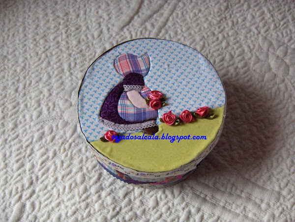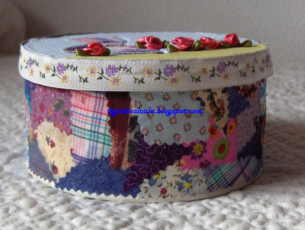 Esta caja de atun reciclada fue para alguien especial que conocí en Creativa de Madrid. Esta hecha con la tecnica del patchwork sin aguja y alrededor está cubierta con trozos de tela. El interior estaba lleno de cositas ricas.