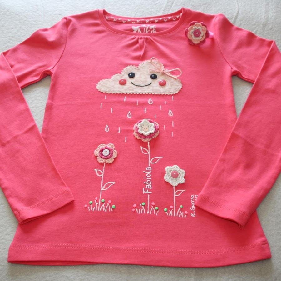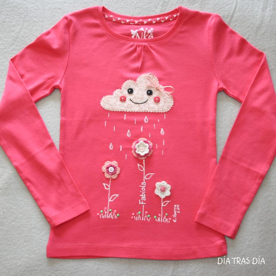 El dibujo de la camiseta ya os resultará familiar, ya que se trata del modelo "En Abril, aguas mil...". Sin embargo, esta vez tienen algo distinto: las he personalizado con el nombre de su destinataria.