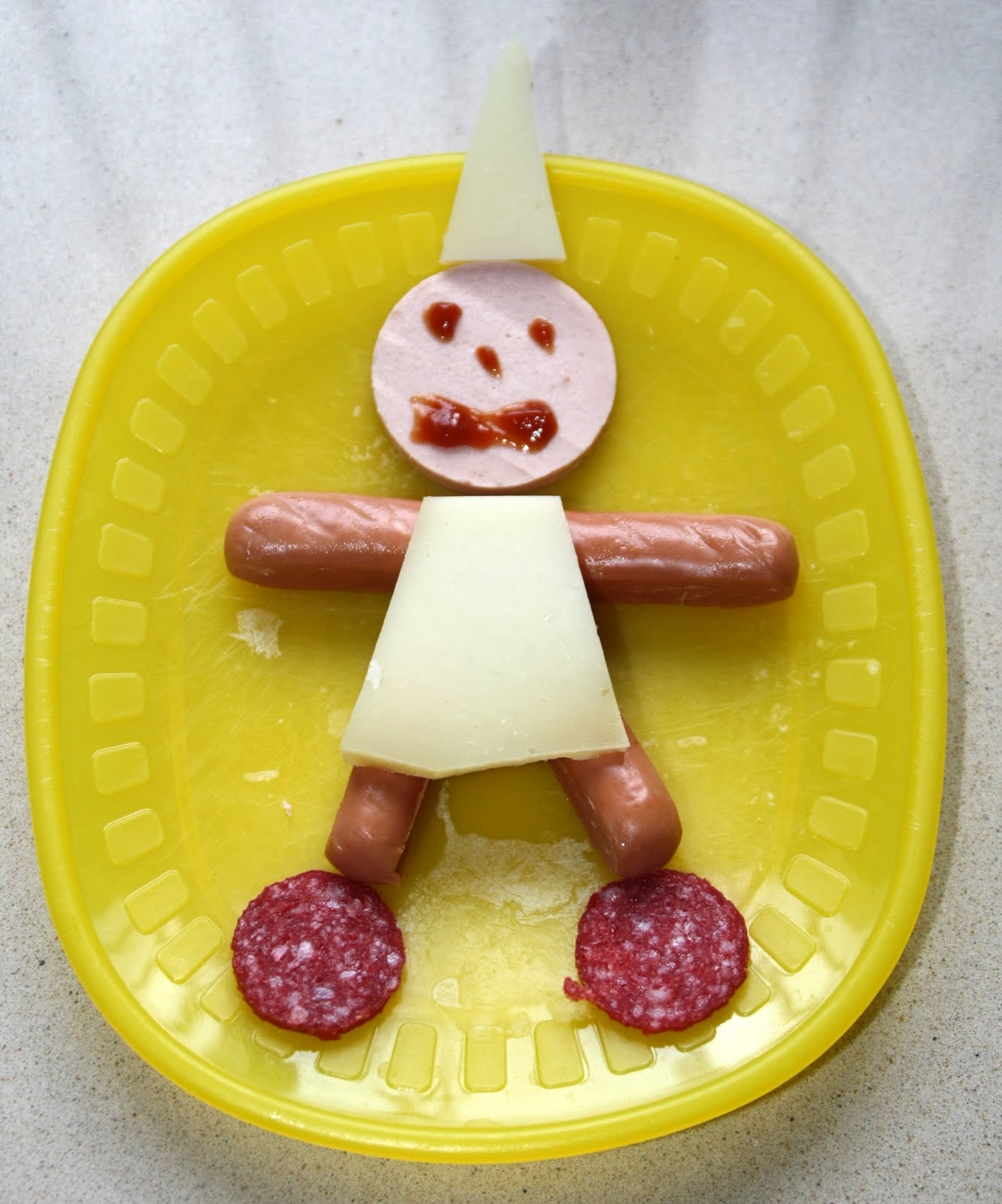 Por si alguien se anima a hacerlo, decir que, además de echarle un poco de imaginación, lo hicimos con una tortilla que cortamos con forma cuadrada. El cuerpo es un biscote de pan tostado untado con paté en la parte del pantalón y queso de untar para la camisa. La boca, la corbata y los brazos se hicieron con salami y los ojos, los dientes y las piernas con una loncha de queso.