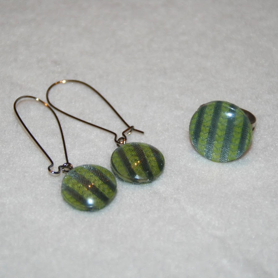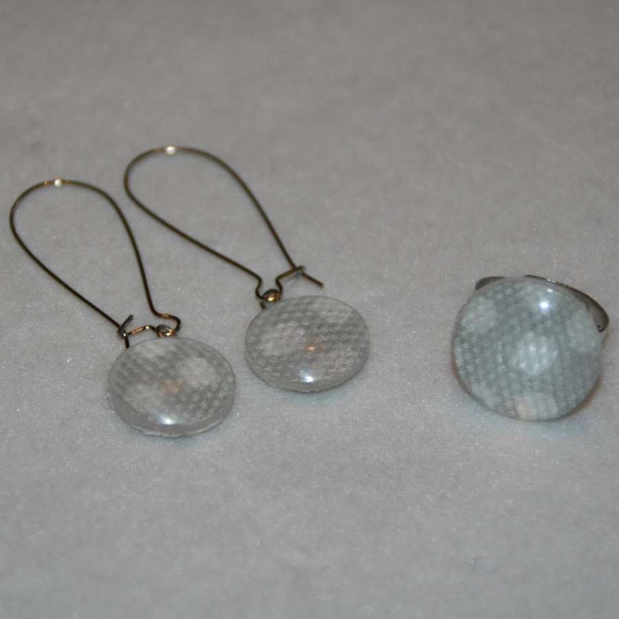 Y de pronto, el otro día se me ocurrió qué uso iba a darles. Decidí que con las más pequeñas haría pendientes y con las más grandes, anillos. Y esto es lo que me salió: 4 conjuntos de pendientes y anillos que decoré con retales de telas que tenía de unas muestras que solicité hace algún tiempo