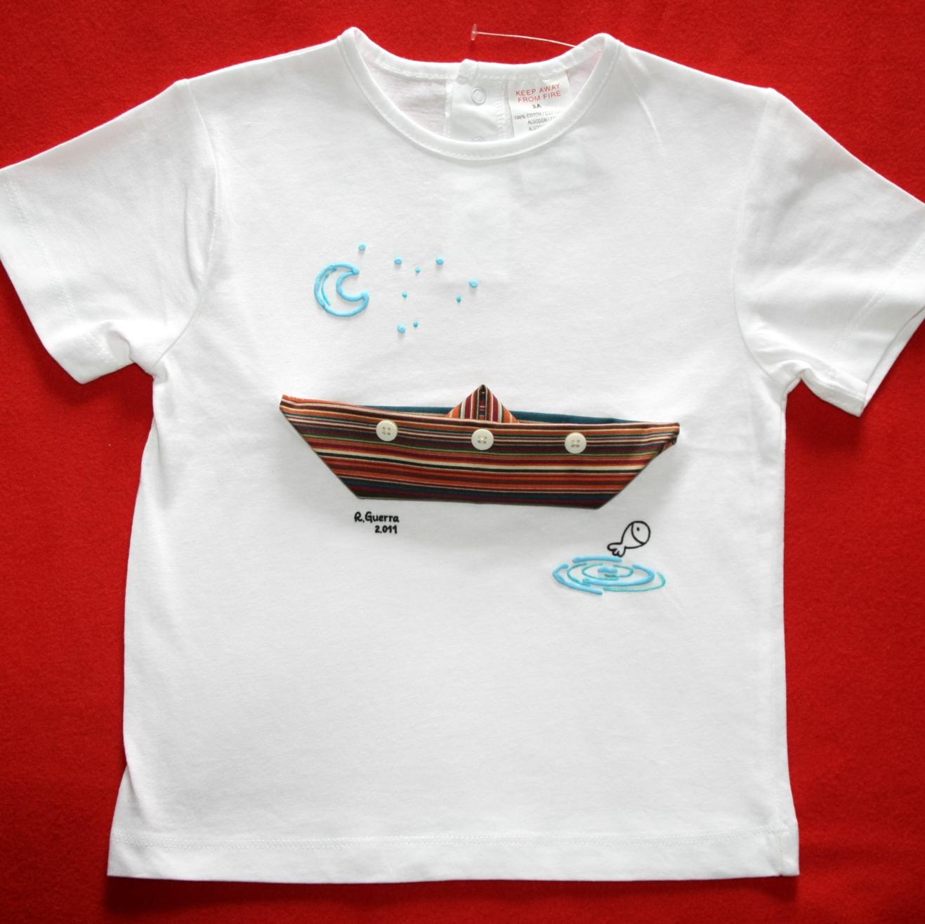 La primera que os enseño es la del pequeño, que ha sido un nuevo modelo que se me ocurrió. Llevaba ya algún tiempo con la idea de hacerla y ahora encontré la oportunidad perfecta para llevarla a cabo. A esta camiseta la he llaado "Había una vez una barquito chiquitito...". Os enseño las fotos y no me lío más: