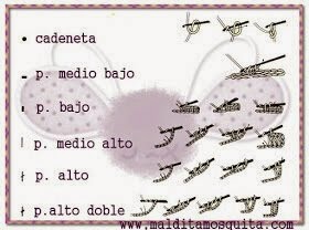 Os dejo también un esquema con los puntos básicos para los que estéis empezando como yo, y necesitéis una referencia, aunque ya véis que para el cesto sólo vais a necesitar los tres puntos probablemente más empleados, el punto cadena, punto bajo y punto raso.