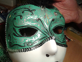 Las máscaras me costaron 1 euro y las he pintado con tempera y luego para que no se descascarillen las he barnizado. En las máscara verde utilicé rollo de lentejuelas para diferenciar la parte que luego seria el antifaz y la pegué con cola blanca, dibuje los arabescos con unos bolis que hay de purpurina en el "chino" que son de purpurina, cuesta unos 2 euros el paquete de 10 bolis, y a los niños les encanta (a mi incluida jijiji).