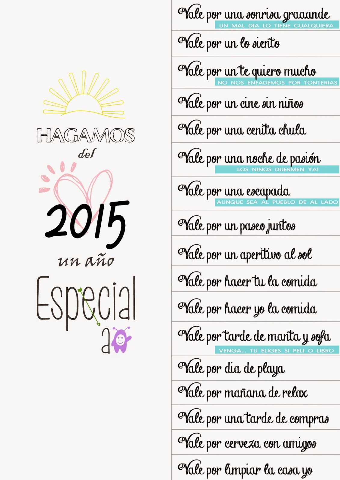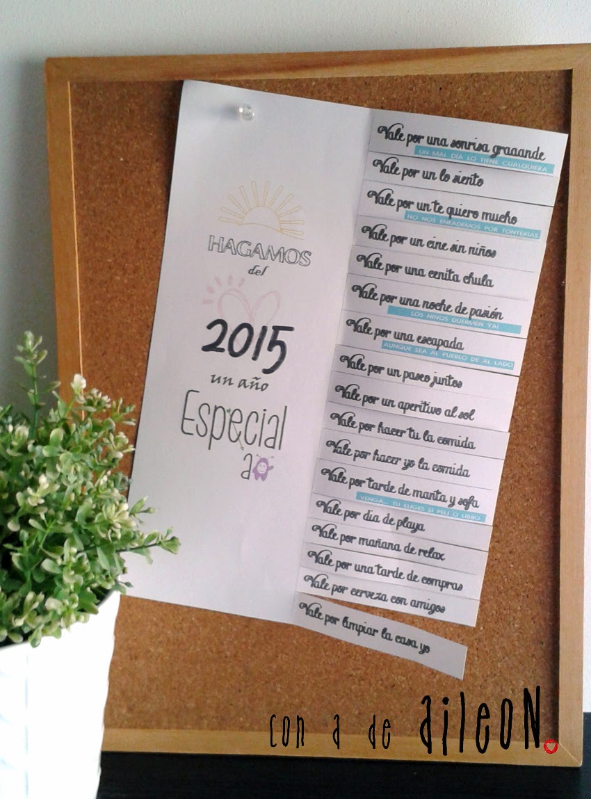Mi propuesta para este año es intentar ser feliz y hacer feliz a los que me rodean, asi que pensando llegué a la conclusión de que si no puedo hacerlo hablando (sabemos que muchas veces, por mucho que hablemos no nos entendemos. La convivencia o la rutina nos come poco a poco así que una forma original de "cortar el hielo" es, aunque sea, decirlo por escrito)¿qué mejor manera que hacer unos vales?