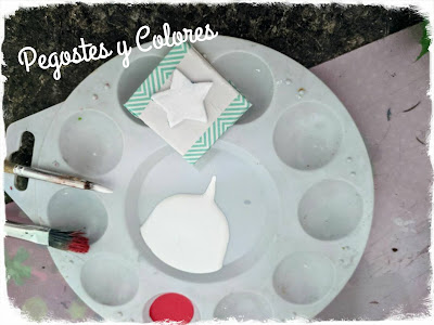 5.- Hice mi propio sello pegando con silicona una pegatina de goma eva (foamy) en forma de estrella en un trozo de cartón grueso. Con un pincel pinte toda su superficie de blanco e imprimi 4 estrellas. Volvi a pintar el sello cada vez que imprimia una estrella nueva.