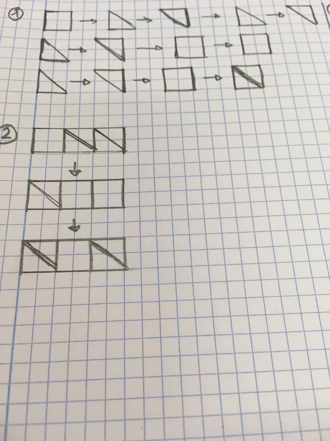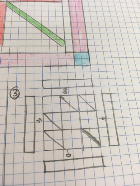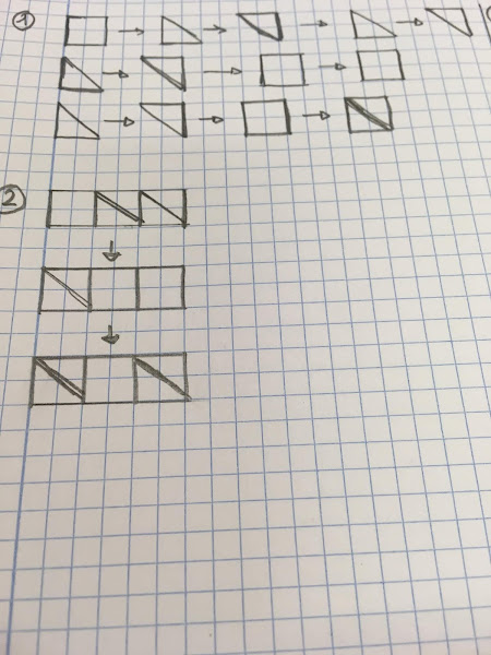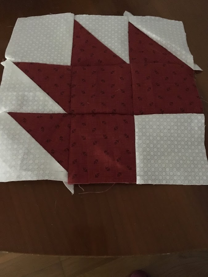 Este bloque constara de dos cuadrados de 6x6 que seran el fondo en un color clarito, luego cuatro triangulos tambien de 6x6 tambien en clarito porque tambien seran fondo y ya luego tres cuadrados en rojo y también 4 triangulos en ese mismo color que seran para formar la hoja, y seran igual de 6x6 cm. Y para finalizar se cortaran 4 tiras de 3cm de ancho (todas estas medidas son sin contar el margen de costura, que sera de 1,5 cm)