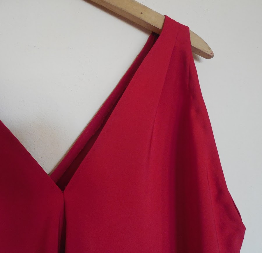 Es bastante amplia y tiene un pequeño pliegue sobre el hombro, es escote en V.