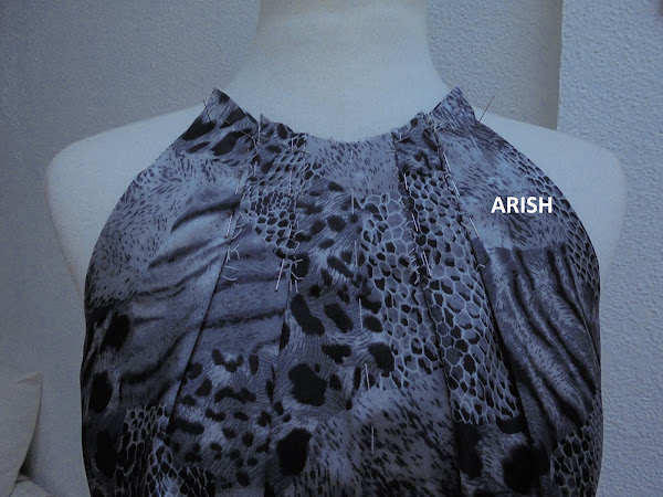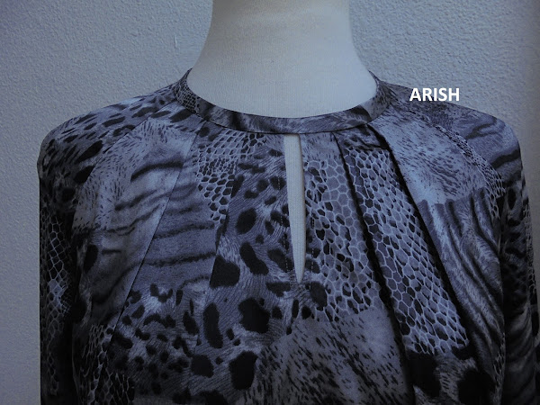 El tejido elegido es un satén fino con porcentaje de elastán con dibujo "animal print" en tonos grises y nada más preparar el delantero lo he pinchado con unos alfileres en el maniquí........impacienteeeee...... y ésto promete....