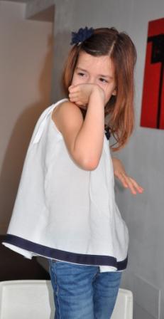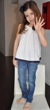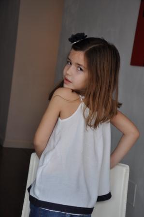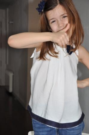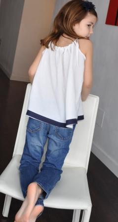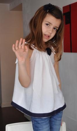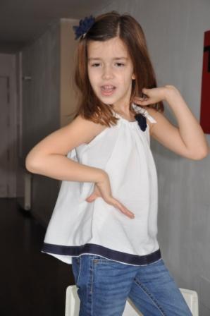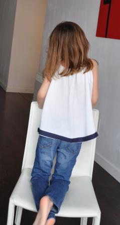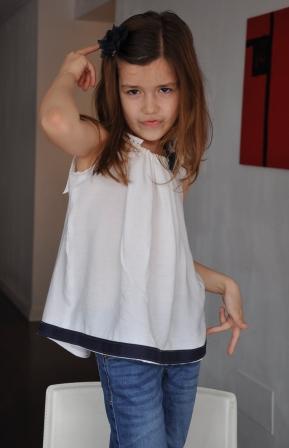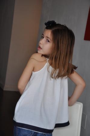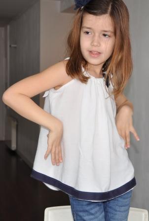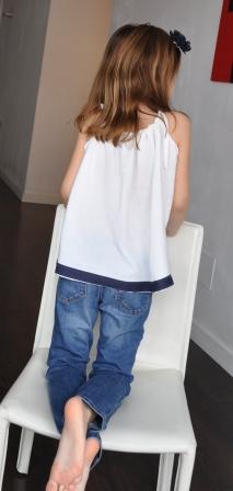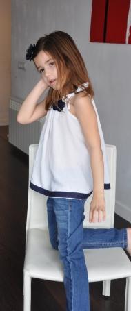 Es una blusa con tirantes en bambula blanca a la que he buesto una tela en azul marino en la parte inferior y una flor en croschet azul marino delante.