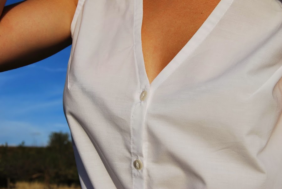 Hoy os traemos una blusita blanca sin mangas, anudada a la cintura. Como no tiene cuello ni mangas es fácil de hacer.