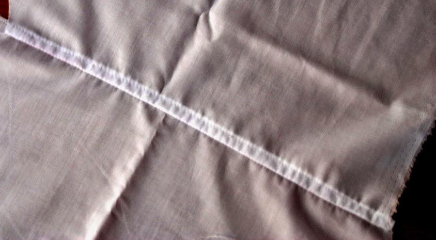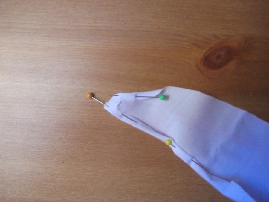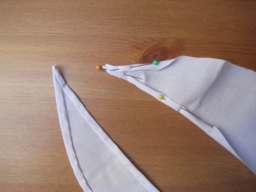 Hilvanamos, doblando la parte larga sobre la más corta, escondiéndola, y cosiéndola sobre la tela de la blusa. Quedará como esto: