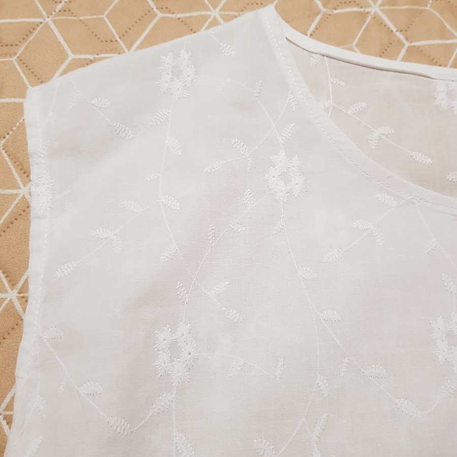 El cuello lo he rematado con cinta al bies de algodon de color blanco , para evitar transparencias ya que la tela es muy finita y algo transparente .