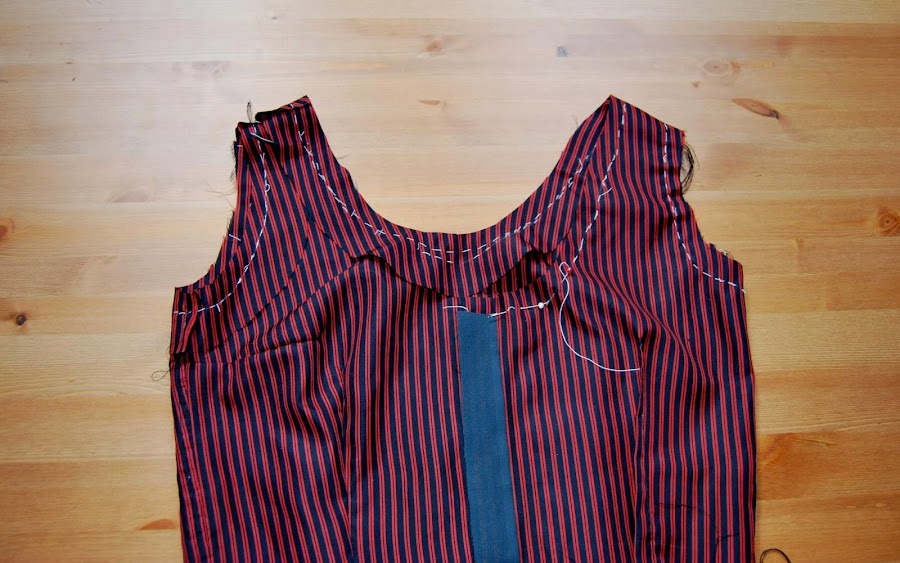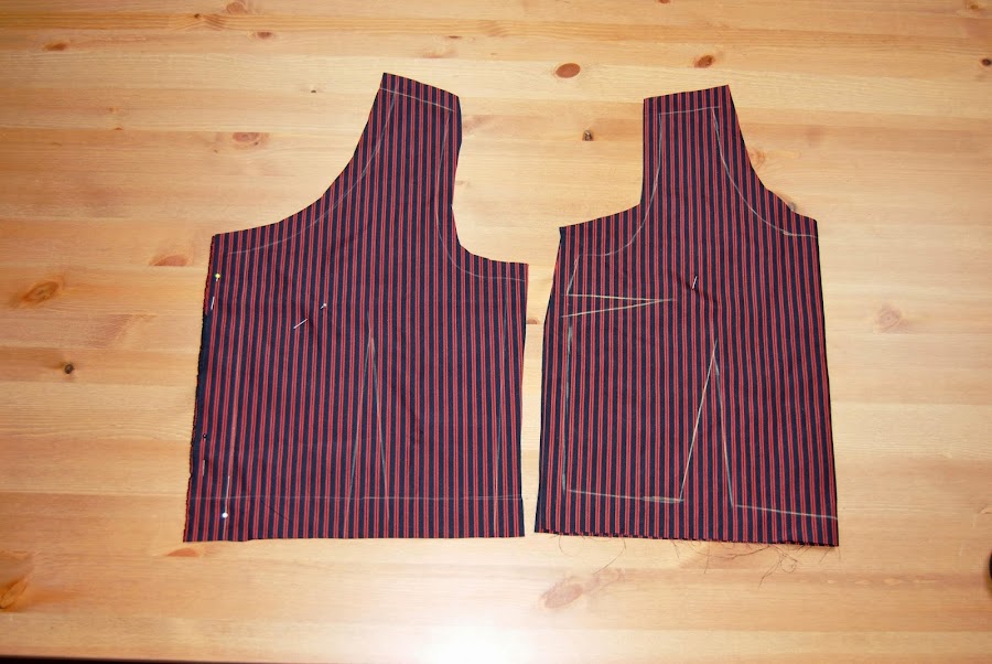 Montamos las pinzas delanteras y de la espalda y las cosemos. Unimos los costados y los hombros y los cosemos también