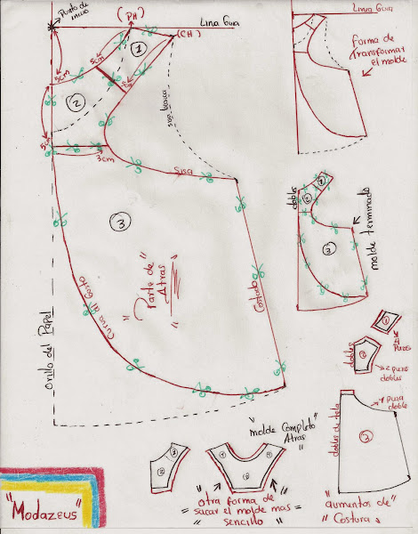 la parte de atrás esta dividida en tres piezas 1-2-3, las piezas se separan por donde están las tijeras y le damos sus respectivos aumentos de costura ( imagen parte de atrás ) en este caso como ira en fileteadora le aumentaremos medio centímetro 0,5 cm , y en caso de ir en plana le aumentaremos 1 cm.