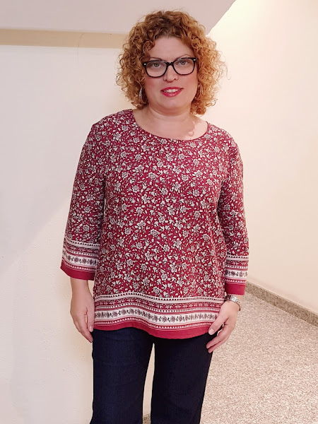 A la hora de cortar la blusa aproveche la tela para que en las mangas tambien saliera la cenefa , creo que de este modo queda mas bonita la blusa .