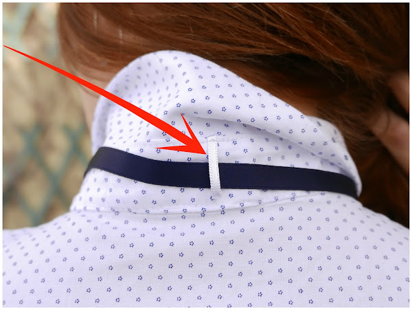 Y os cuento un pequeño truco para que el lacito permanezca en su sitio aunque la tengamos puesta o en el armario colgada. se trata de introducir a la mitad de la tira del cuello, cuando la cosamos una pequeña cinta de raso o de cualquier otro material. De este modo tenenemos por donde introducir el lazo que después queda visible y el que va debajo del cuello, no lo verá nadie, pero nos asegurará muy bien nuestra lazada.