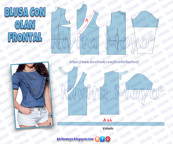 Tomar la medida que tienen la curva ( A ) y trazar un rectangulo que mida de ancho 4 vesces esta medida por el alto deseado, pueden ser 5 cm. Este se pulira en uno de sus bordes largos y por el opuesto se fruncira para que ocupe el real recorrido que se creo con el recorte. Se aplicara intercalado entre ambas piezas del delantero.