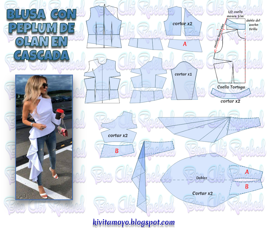 Diseñar desde le patron basico de cuerpo. En el trasero trasladar el entalle al centro del patron en la cintura. En uno de sus lados eliminar el hombro hasta el centro del patron y en el escote restar 1 cm para aplomar la linea en digonal. Diseñar el faldon o peplum irregular. Cerrar las pinzas y crear una pieza unica. En el delantero eliminar un hombro trazando una diagonal en el lado opuesto que se trazo en el trasero, desde el centro del escote hasta la sisa. En la mitad de ese recorrido, se practicara un pinza auxiliar de 1 cm para aplomar el escote. Dibujar el peplum igual que el trasero. Diseñar una manga trompeta, dando amplitud en el bajo de la misma. Trazar un cuello tortuga, tomando de referencia el delantero. Desde un rectangulo apoyado en el escote, que mida de alto el doble del ancho del cuello deseado, por la mitad del contorno del cuello menos 1 cm. Desde el vertice superior opuesto a la base del rectangulo, trazar una diagonal que llegue a la sisa, para cerrar el centro trasero del cuello. El patron estara doblado desde el centro delantero y se cortaran 2 piezas para armarla forrada. Se aplicara en la parte de la blusa con hombro y manga, en la otra parte ira pulido entre si y flotante. Debe llevar un boton o gancho para colocarlo.