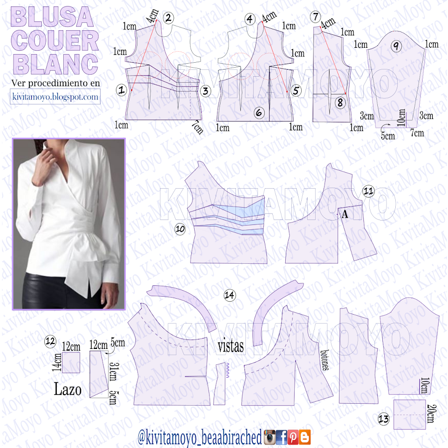 Una característica de esta blusa informal es que cuenta con dos delanteras que se solapan. pero solo efectuaremos el drapeado en el lado que superpuesto. La otra delantera que también cruza en el interior, se trasladara la pinza de busto a la parte inferior. La costura de la misma quedara oculta en el cruce.