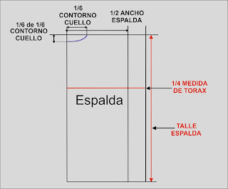 Empezaremos haciendo el patrón de la espalda, la haremos según las medidas, que nos habremos tomado previamente y siguiendo estos 3 pasos. Partiendo de un rectángulo y colocando nuestras medidas según se indica: