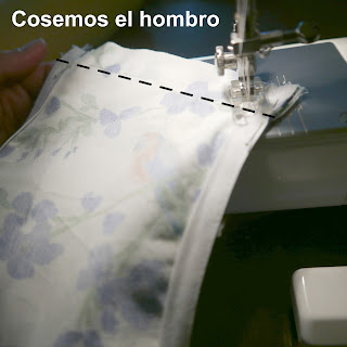 Como la espalda está compuesta por piezas cosidas y vueltas, es sencillo coser un pespunte a 1 cm del canto e introducir por él una goma de 05 cm, que frunza ligeramente la zona.