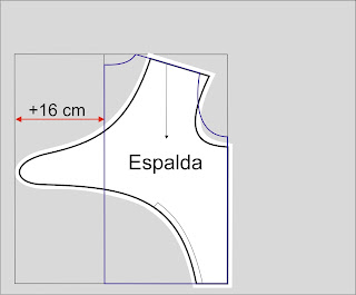 Y finalmente transformamos la base en la espalda que buscamos. Escotando la espalda y creando a la altura donde solemos llevar el sujetador una forma saliente de 16 cm de larga (incluyendo 1 cm de costura)