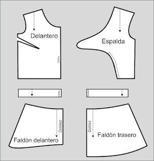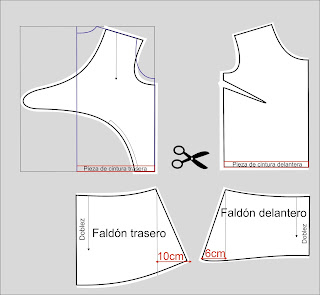 Ahora crearemos las piezas de faldón, ligeramente acampadas y siempre siguiendo que en la cintura y en los laterales tengan la misma longitud, para que sean más fáciles de coser.