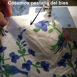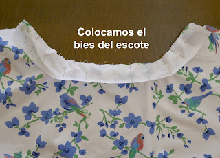 Empezamos colocando el bies que corresponde al cuello sobre el escote: