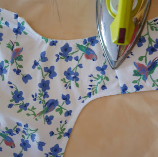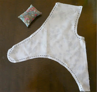 Una vez que ya tenemos cosido el escote, podemos empezar con las sisas siguiendo los mismos pasos con los bieses que para el escote. A la vez podemos colocar la pieza de cintura correspondiente al delantero y unirla con un pespunte.