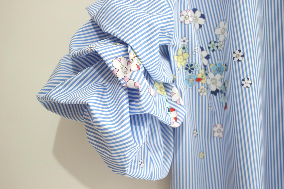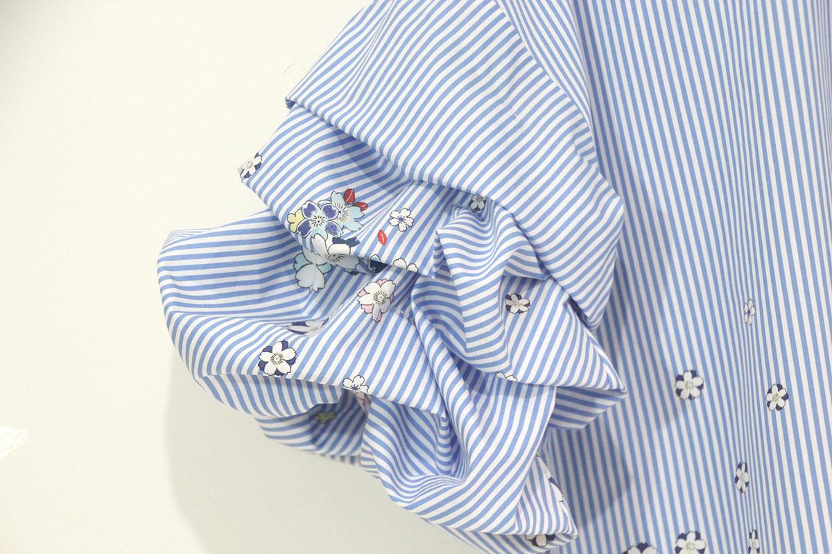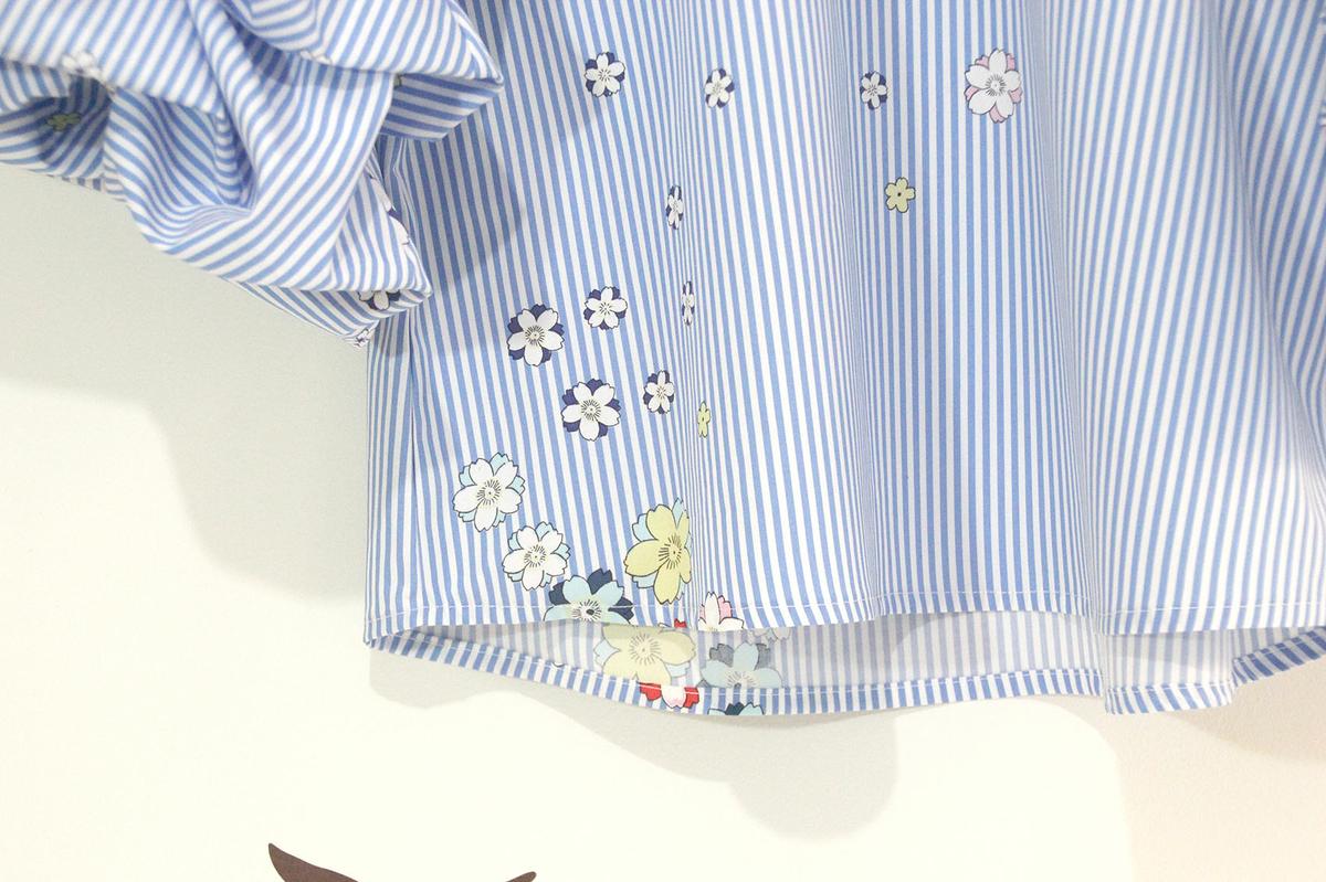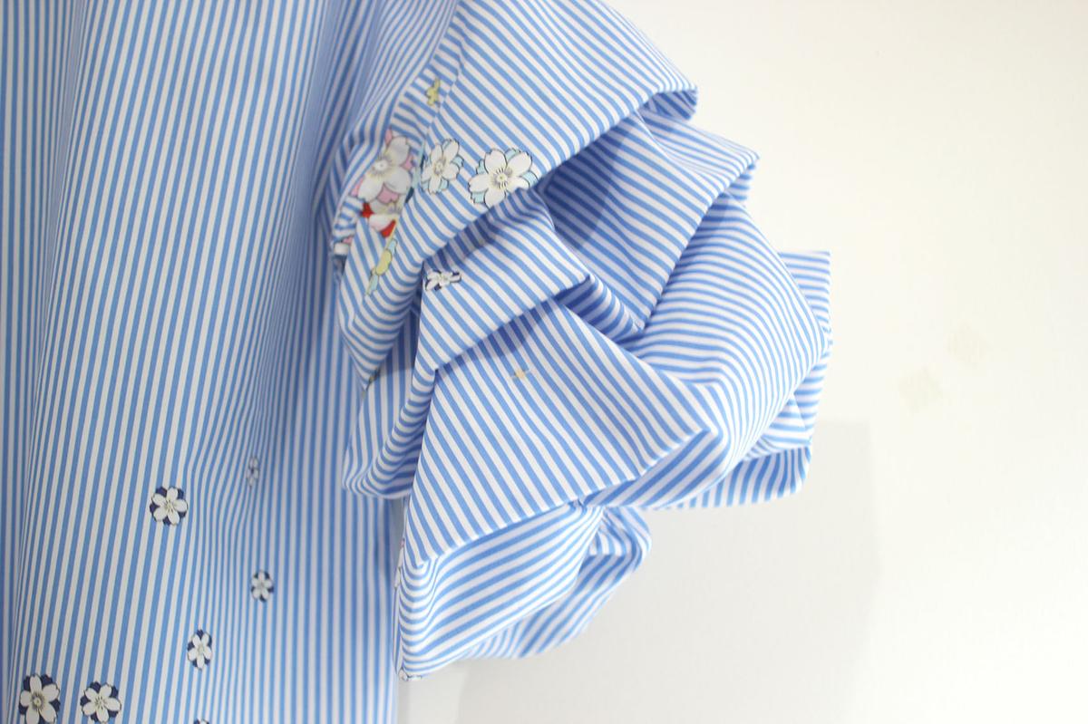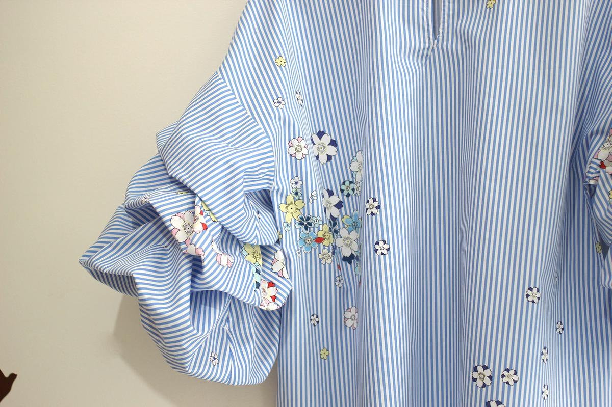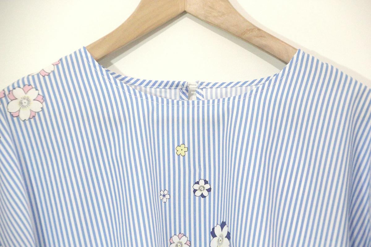 La tela que he utilizado para hacer esta blusa es un popelín o tela de camisa, de rayas vichy con un estampado en flores. La compré de retales hace mil años, pero he encontrado esta tela que me tiene enamorada, es un vichy de rayas azules con mariquitas bordadas!!!!!