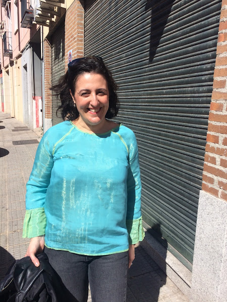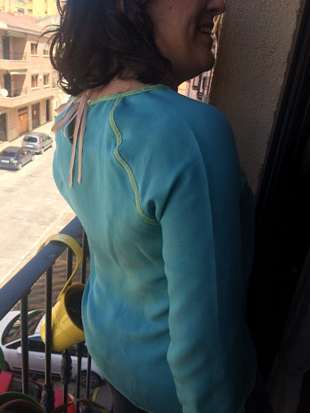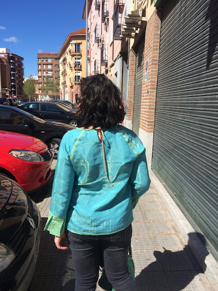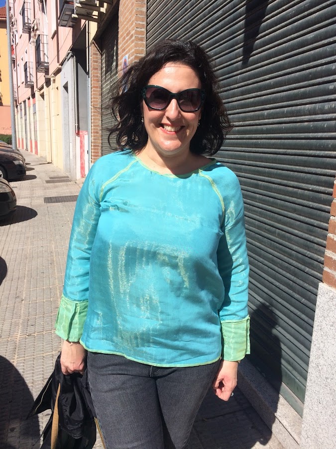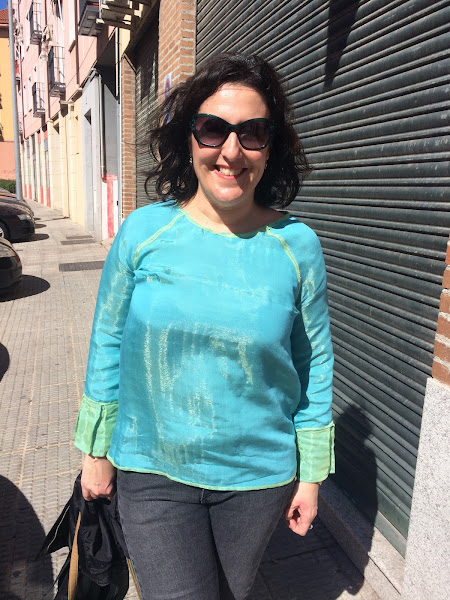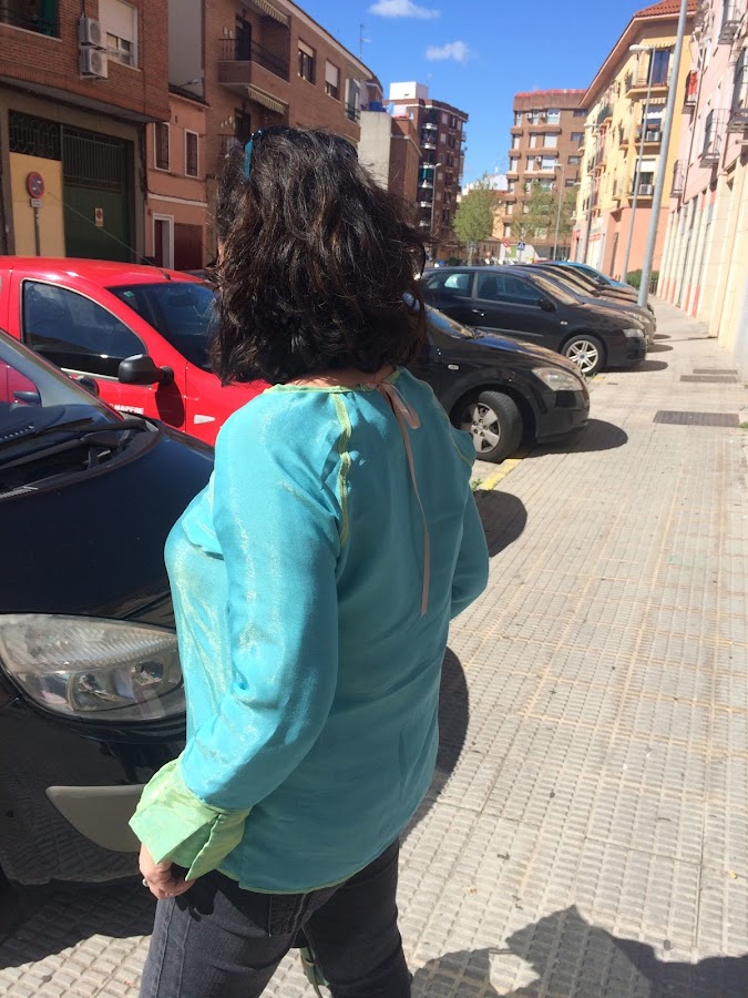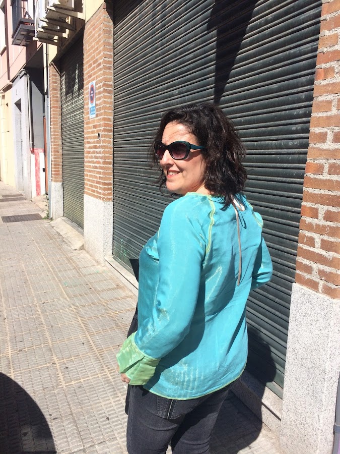 Como veis la tela hace aguas en los dos tonos, cuando la da el sol se nota aún más, cuando es con menos luz o sombra se nota menos los dos tonos en aguas, me pareció perfecto combinar con vaqueros para restar un poco de seriedad y elegancia a la blusa, hacerla más ponible.