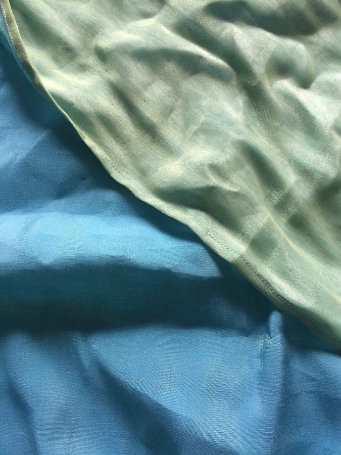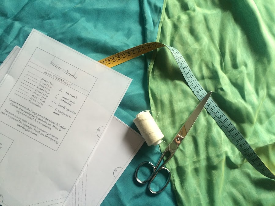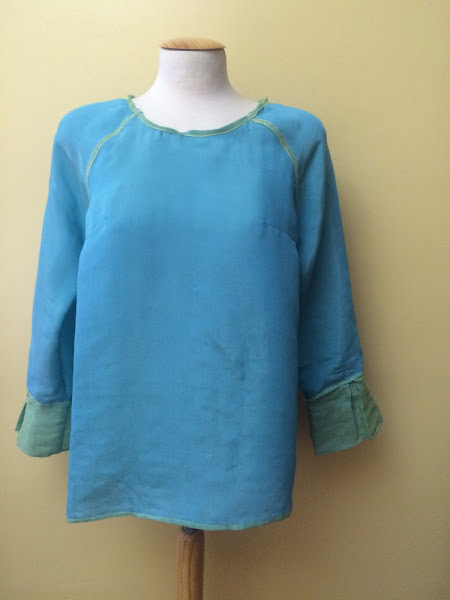Decidí coger el foulard y convertirlo en una preciosa blusa. Pero ahora surgía el siguiente problema. La tela es una seda reversible, por un lado verde y por el otro lado en azul, porque lado hacia la blusa, los dos lados me encantaban y no decidía cual....comencé a dar vueltas al foulard, para acá, para allá.....
