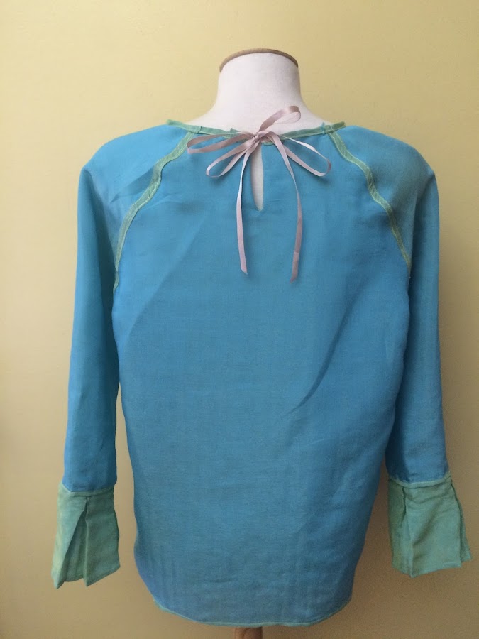 Las mangas van en los dos tonos de la tela, los borde de toda la blusa en contraste y la unión de la blusa y las mangas también en contrate de los dos tonos.