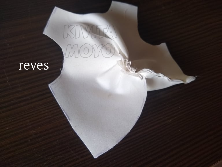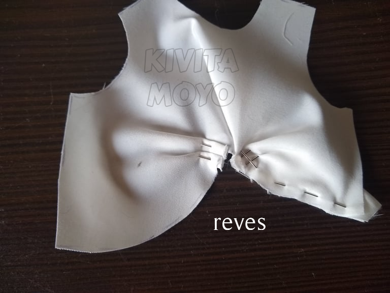 Por el revés se vera de esta manera. Invertido vemos que a un lado aun permanece libre o sea la parte que corresponde al flanco izquierdo. En el lado opuesto se ve la costura que acabamos de hacer uniendo el lateral que pertenece a la derecha. Observamos que los pliegues encarados en el centro serán el drapeado, y ese pliegue que parte desde el hombro será desde el derecho, el efecto de cruce o solapado.