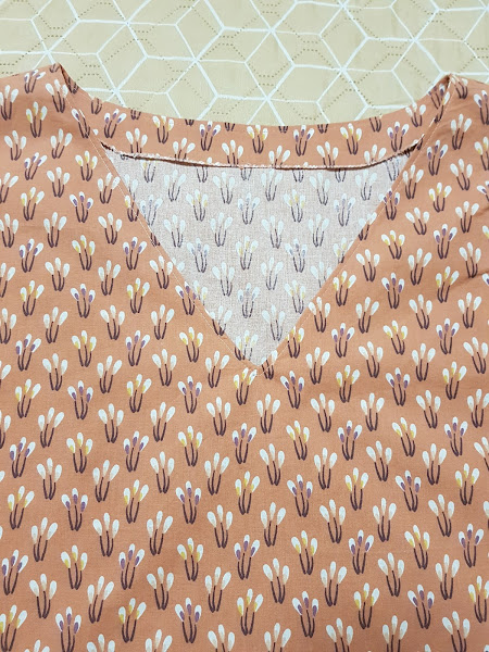 Esta vez el cuello de pico lo he pulido con un bies del mismo tejido , es lo mejor para este tipo de cuello , la terminación es más bonita.