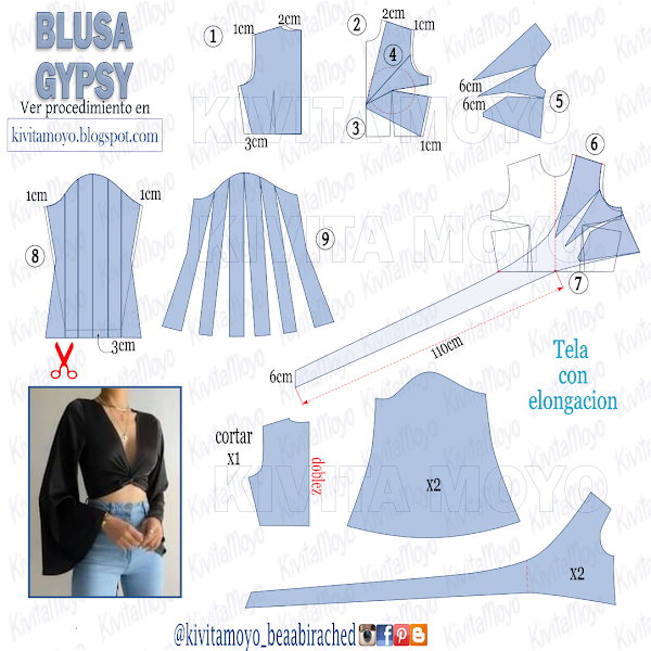 La parte delantera se puede resolver de dos maneras. Una es cortándola por cada mitad de la delantera 2 veces. O sea seria forrada con la misma tela. Y encarando los derechos pulir escote cruce y lazo hasta el lateral en la cintura. Dar vuelta planchar y unir a la parte trasera por hombros y laterales, para luego aplicar la manga. Esta seria la terminación indicada para una prenda mas elegante, o para un complemento de otra prenda de gala. O si la tela fuera muy traslucida.