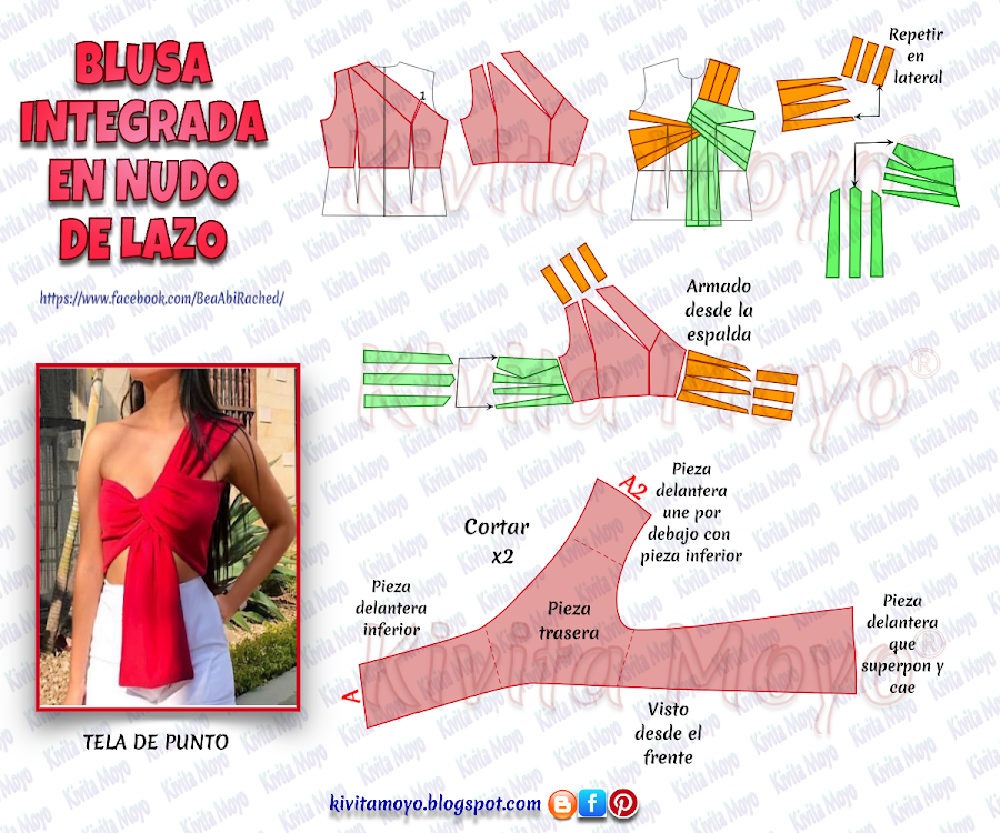 Para armarla se unen el extremo del lateral A con el extremo del hombro A2 haciendo pliegues o frunces. Esta costura se hace desde el inerior del embolsado de la forreria. Luego se da vuelta por una abertura que se deja en el bajo de uno de los extemos. Con este tratamiento no se ve costura expuesta desde el reves de la prenda.
