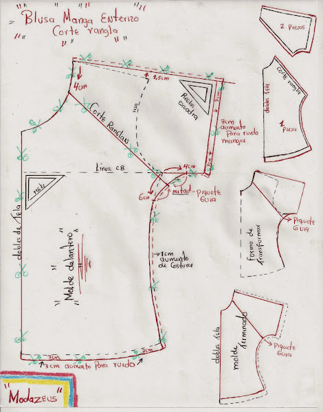 desde la parte mas alta del hombro ( PH ) y por el escote le bajamos 4 cm ( al gusto ) y por debajo de la manga-costado, sacamos la mitad, y unimos estos dos puntos. con esto se traza el corte ranglan ( imagen delantera)