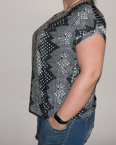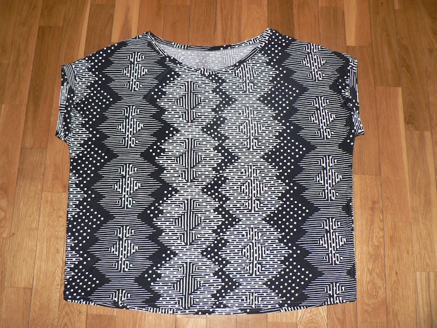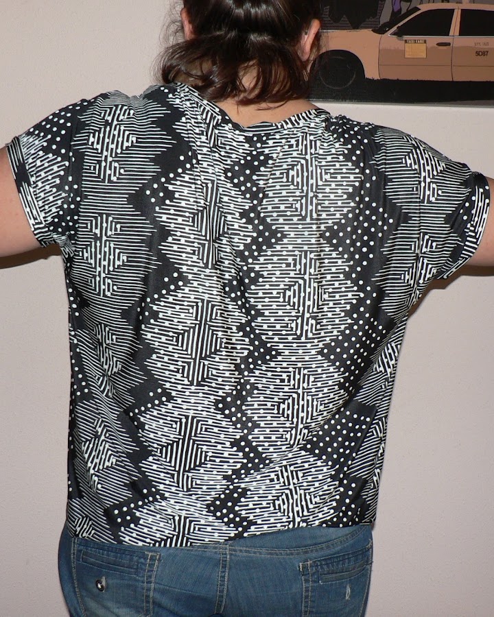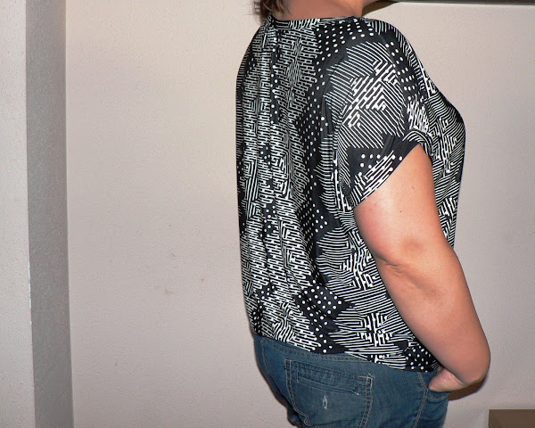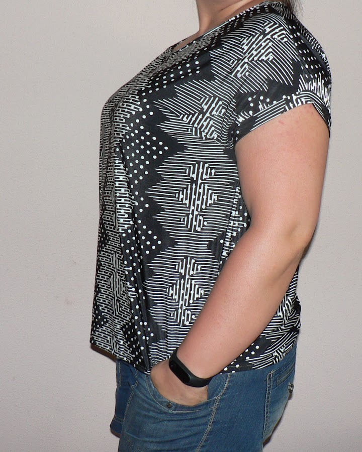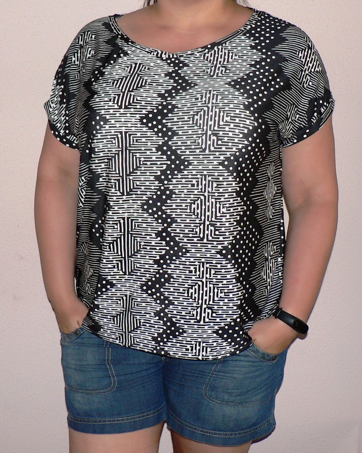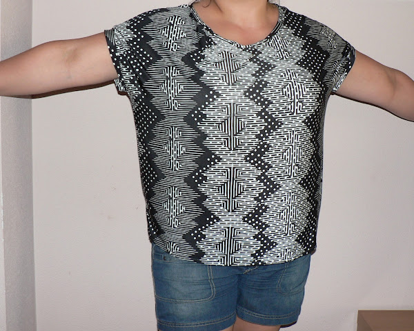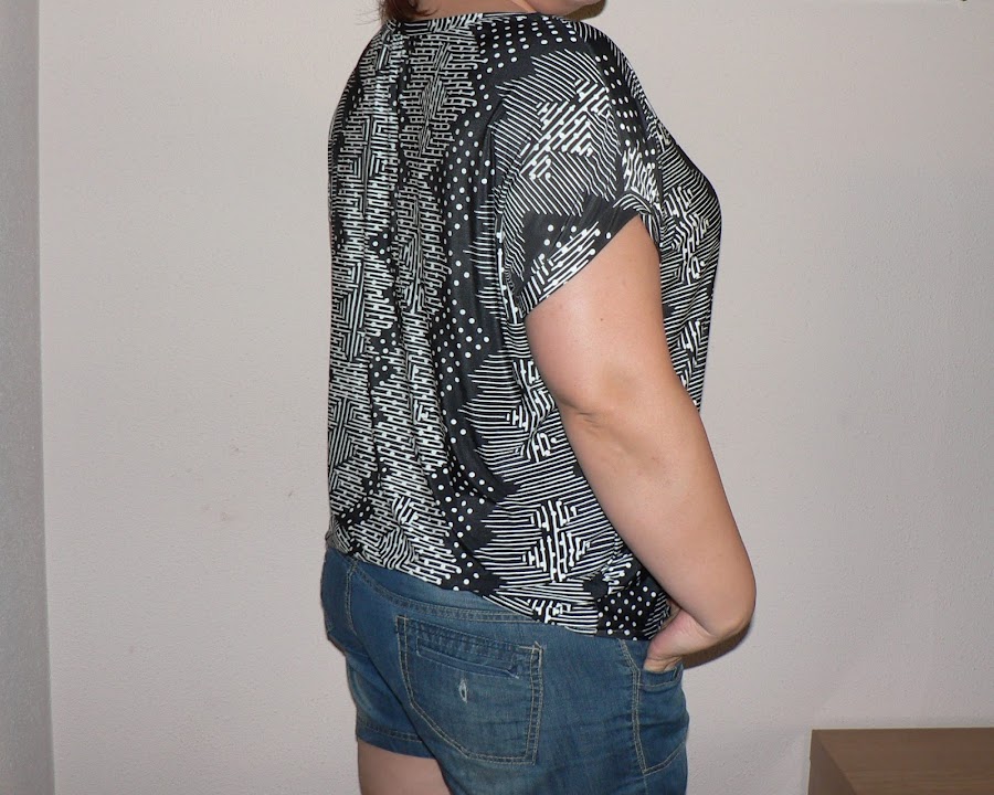 Para probar, corté una talla M. Pienso que me correspondería la talla L pero como era muy ancha y la ropa excesivamente ancha me hace (todavía más) bajita, probé primero con la M. Y me gusta! Me queda holgada pero no demasiado. Deja correr la brisa pero no estorba. Y sobre todo, no parezco una niña de seis años con la blusa de su madre.