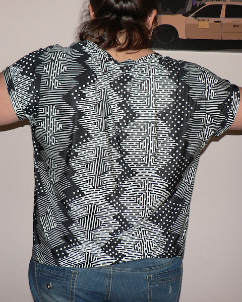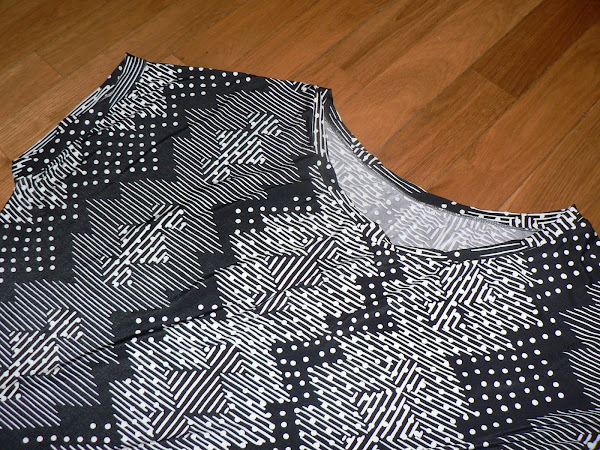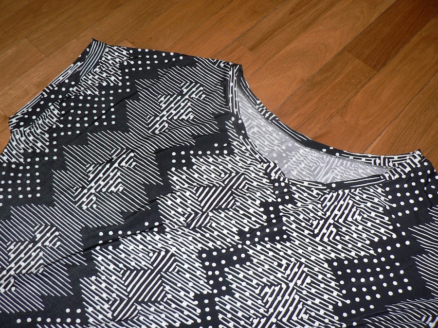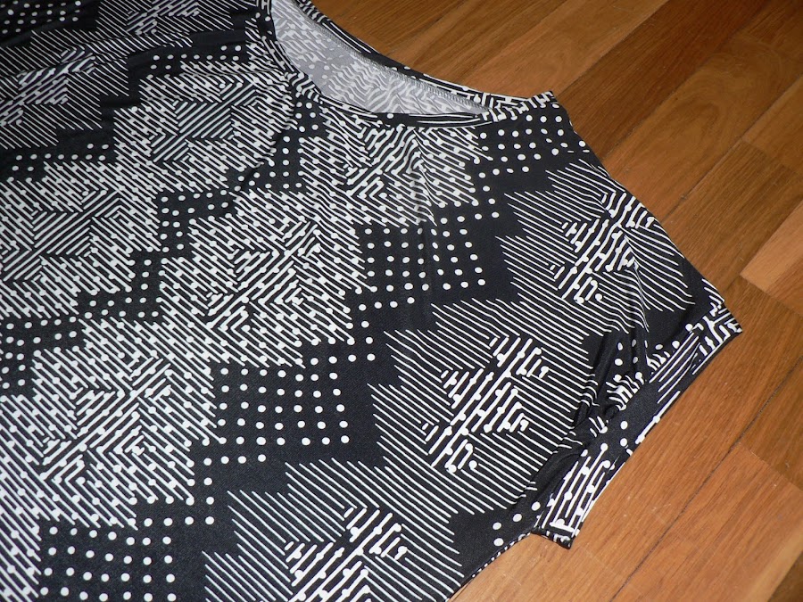 Y como esto era una prueba. pues simplifiqué el cuello y las mangas haciéndolas con puños hechos en la misma tela para que fuera una de esas costuras pim-pam. Las vistas en el cuello me gustan mucho para una tela tipo viscosa o algodón, pero para una tela de camiseta, me gustan más los ribetes o los puños.