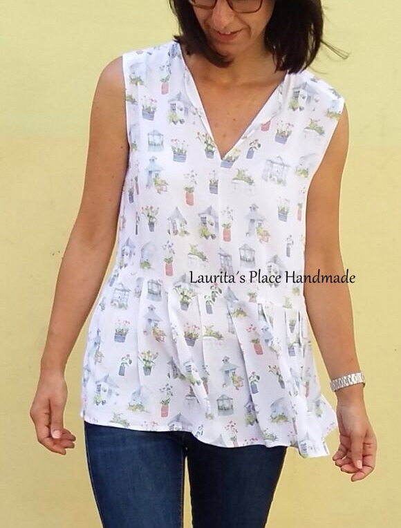 Es una tela que me encanta tanto por los dibujos como por el tacto. El modelo escogido ha sido una blusa con peplum de la revista Burda Style de 06/2017. Utilicé la talla 36 y a la vista de que no me quedaba muy bien el cuello, le metí un corte en el frente que me vino muy bien a su vez para dejarla un poco más estrecha. Sigo teniendo el problema de las tallas con esta revista, me suelen quedar grandes las tallas, a pesar de que habitualmente uso la talla 38 y muchas veces la 40.