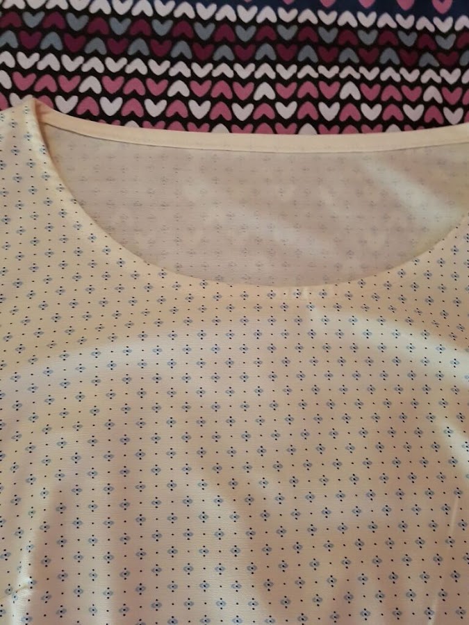 El escote es redondo y lo he pulido con cinta al bies de algodon de color amarillo claro.
