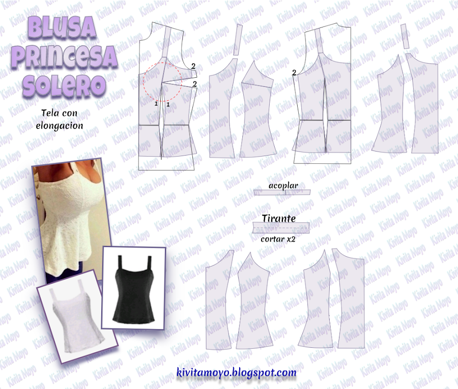 Cortar en telas con elongacion. Diseñar el delantero con escote y sisa de solero hasta la altura de la primera cadera, conservando la pinza de entalle y de busto. Descontar 2 cm en el lateral para la elongacion. Tomar de referencia el Radio de mama, y acentura 1 cm en el bajo busto desde la pinza de entalle. En el bajo dar una leve amplitud.