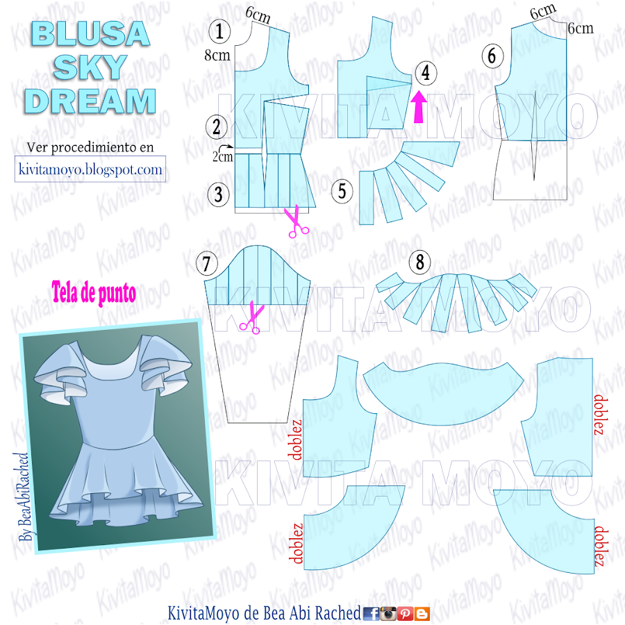 Esta concebida para telas de punto, por lo que veremos la transformación el patrón básico de blusa que originalmente lleva pinza de entalle y busto, pera suprimirlas, manteniendo el aplomo. Del igual forma transformaremos la manga y la parte superior de la falda para crear el efecto olan.