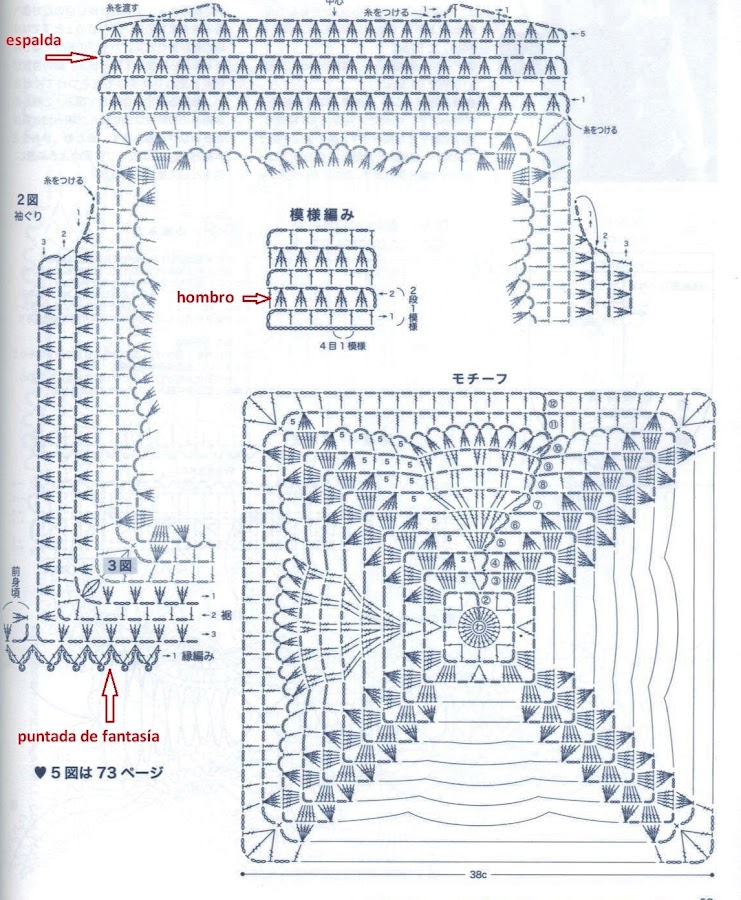 En la segunda imagen se presenta el gráfico con el que se realizó este trabajo, se hacen dos cuadrados iguales con cuatro o cinco vueltas en la parte de los hombros, se unen por los costados y se termina con puntada de fantasía trabajando en redondo en la parte inferior.